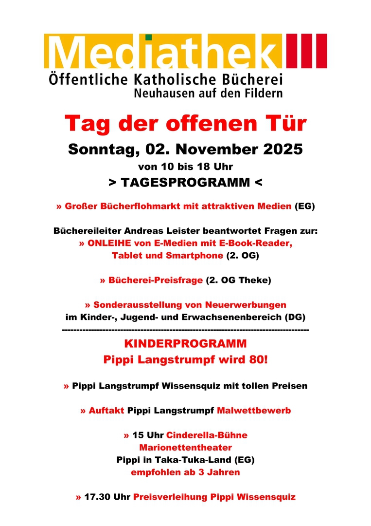 Am Sonntag, 02. November 2025, lädt die Bücherei von 10 bis 18 Uhr zum Verweilen, Schmökern und Ausleihen ein. Zahlreiche Neuerwerbungen von Medien sowohl im Kinder-, Jugend- und Erwachsenenbereich werden erstmalig zum Entleihen angeboten.